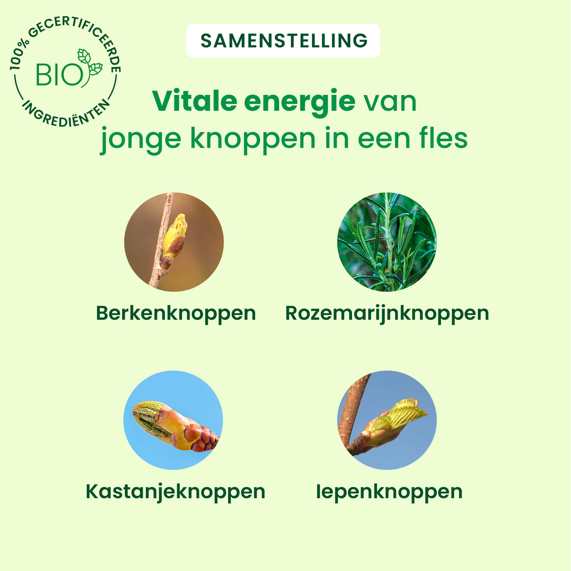 Jus de pruneaux*, jus de pommes*; macérats glycérinés de : bourgeons de bouleau pubescent*, bourgeons de bouleau verruqueux*, jeunes pousses de romarin*, bourgeons d’orme*, bourgeons de châtaignier*, jeunes pousses de bruyère*.